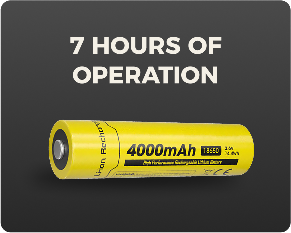 Zentron products are powered by one 18650 battery, delivering up to 7 hours of continuous operation per set.